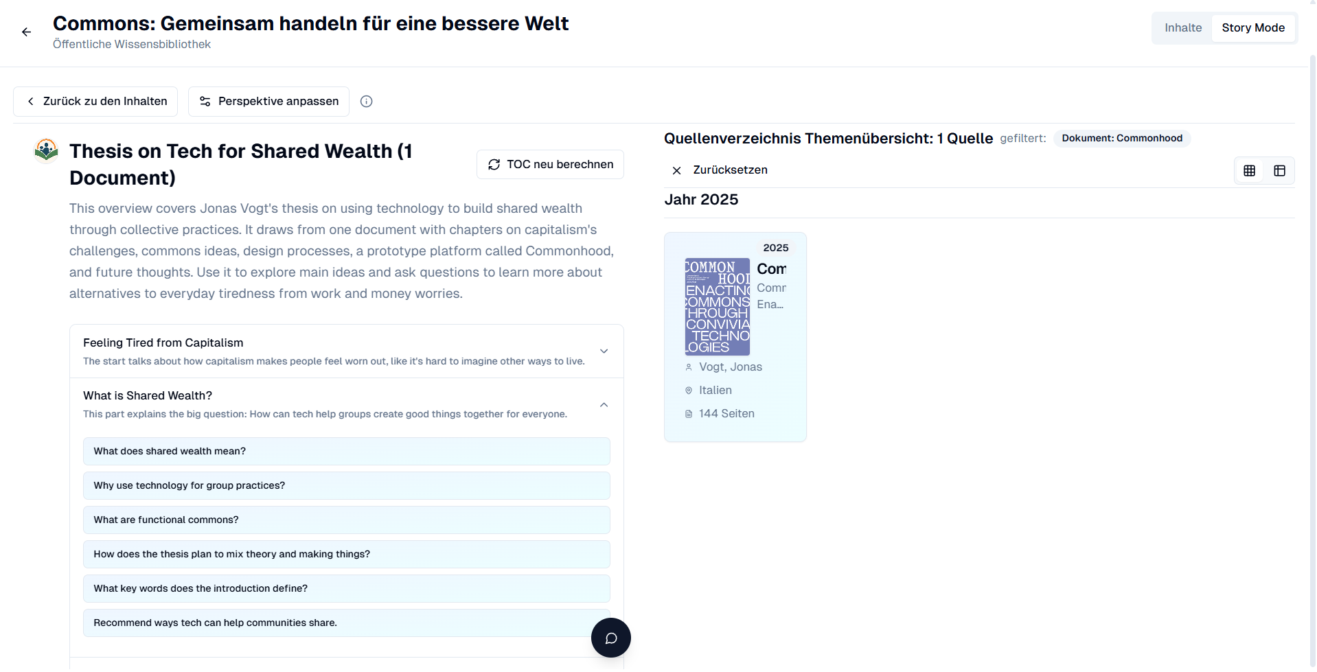 Der „Geschichtenmodus” führt Sie zu einem Chat, der Ihnen eine kurze Beschreibung des Buches (oder der Quelle) zusammen mit einer Reihe von Feldern anzeigt, die die Hauptthemen erläutern. Wenn Sie diese Felder aufklappen, werden Ihnen Fragen vorgeschlagen, die Sie im Chat stellen können, um Sie beim Lesen zu unterstützen und Ihnen zu helfen, die Informationen besser zu verstehen. Sie können auch Ihre eigene Frage eingeben, indem Sie auf das schwarze Symbol unten rechts klicken.